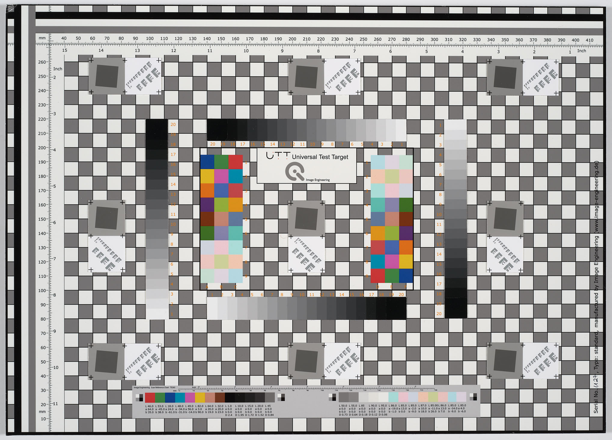 A Device Level Target (DLT) takes the place of the object that’s to be digititzed and fills the best part of the frame. It includes color and grey patches, a ruler and patches to evaluate sharpness and to detect aberations. A DLT is typically captured at the beginning and end of a batch.